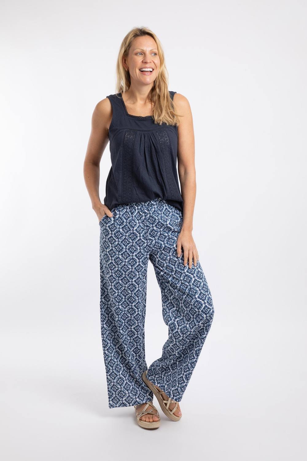 Lightweight and breathable mid blue printed wide leg trousers made from a muslin-style textured material. Ideal for holidays and warmer weather, pair with a block colour vest for a co-ord style.