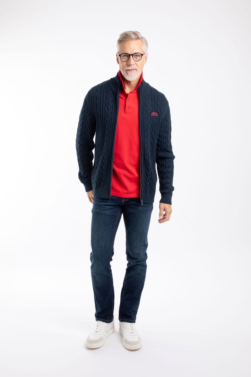 Stylish Navy cable knit jumper by Weird Fish. Features a full zip, chunky cable knit design, and a contrast colour embroidered chest logo. Ideal for layering during transitional months.