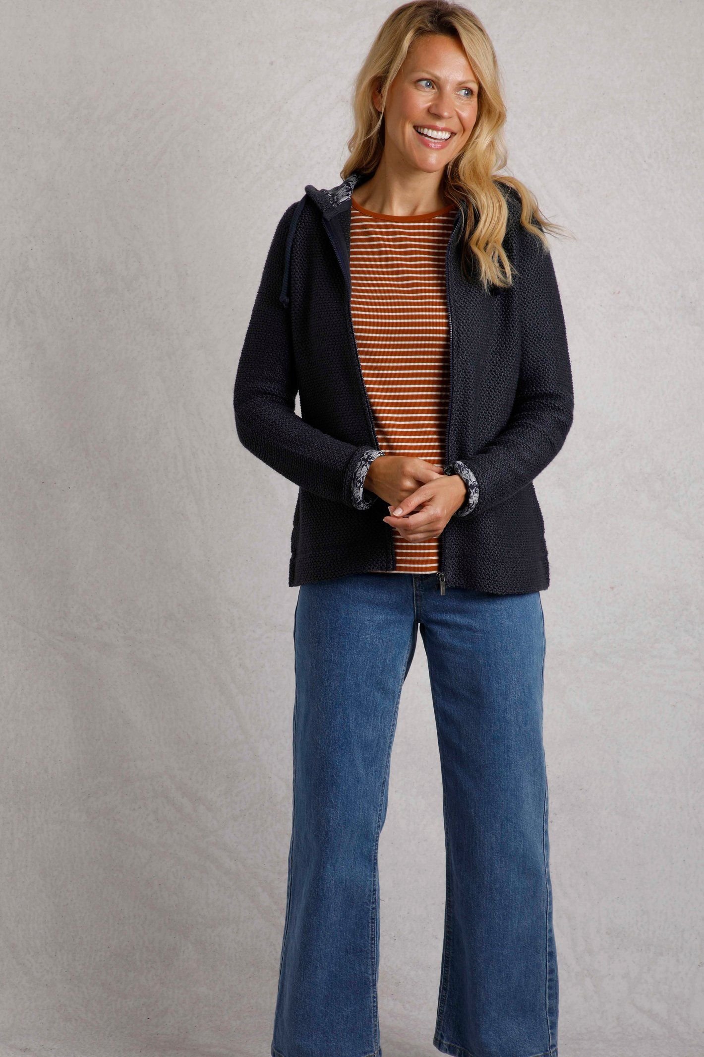 The Weird Fish Navy Macaroni Full Zip Hoodie is available in sizes 10, 12, 14, 16, 18, 8.