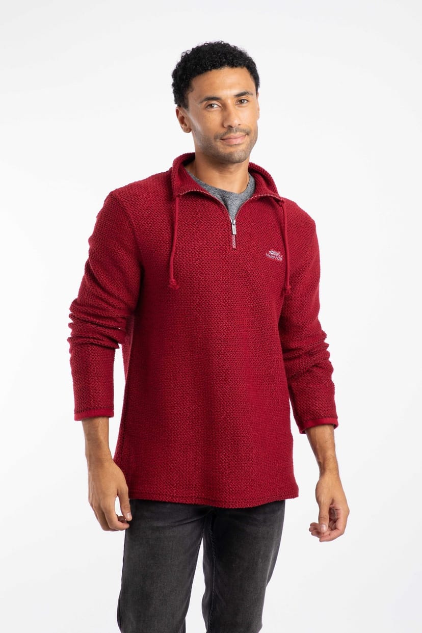 Iconic Weird Fish sweatshirt in red with a circular knitting texture. Features a 1/4 zip and a hooded neckline. Perfect for casual wear.