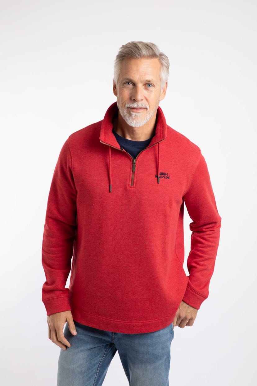 Classic men's sweatshirt in scarlet with a ribbed stand-up collar and branded eyelets. Features an iconic fish bones zip pull and a brushed interior for added comfort. Perfect for casual wear.