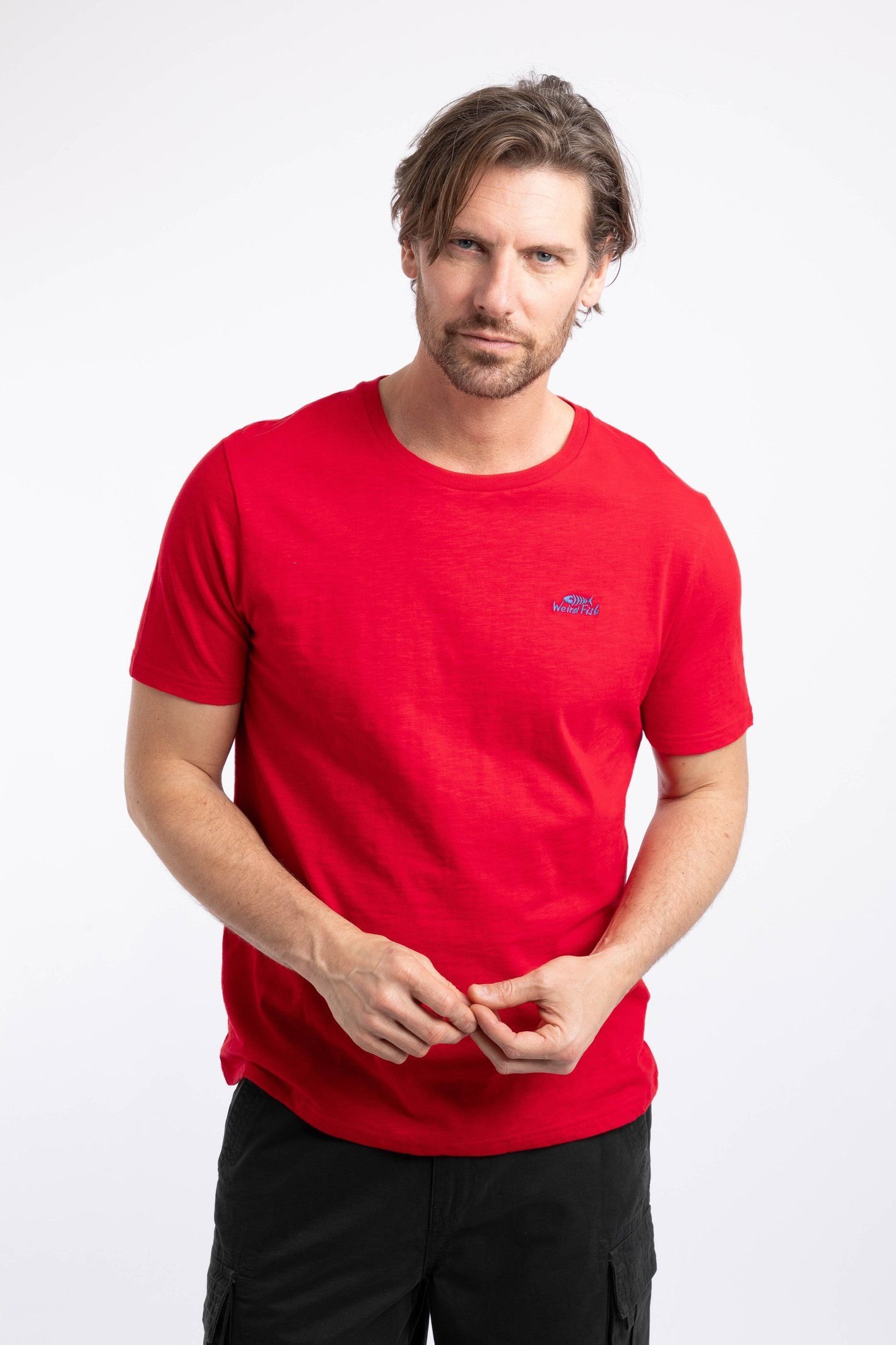 The Weird Fish Men's Fished Branded T-Shirt in Scarlet is ideal for casual, everyday.