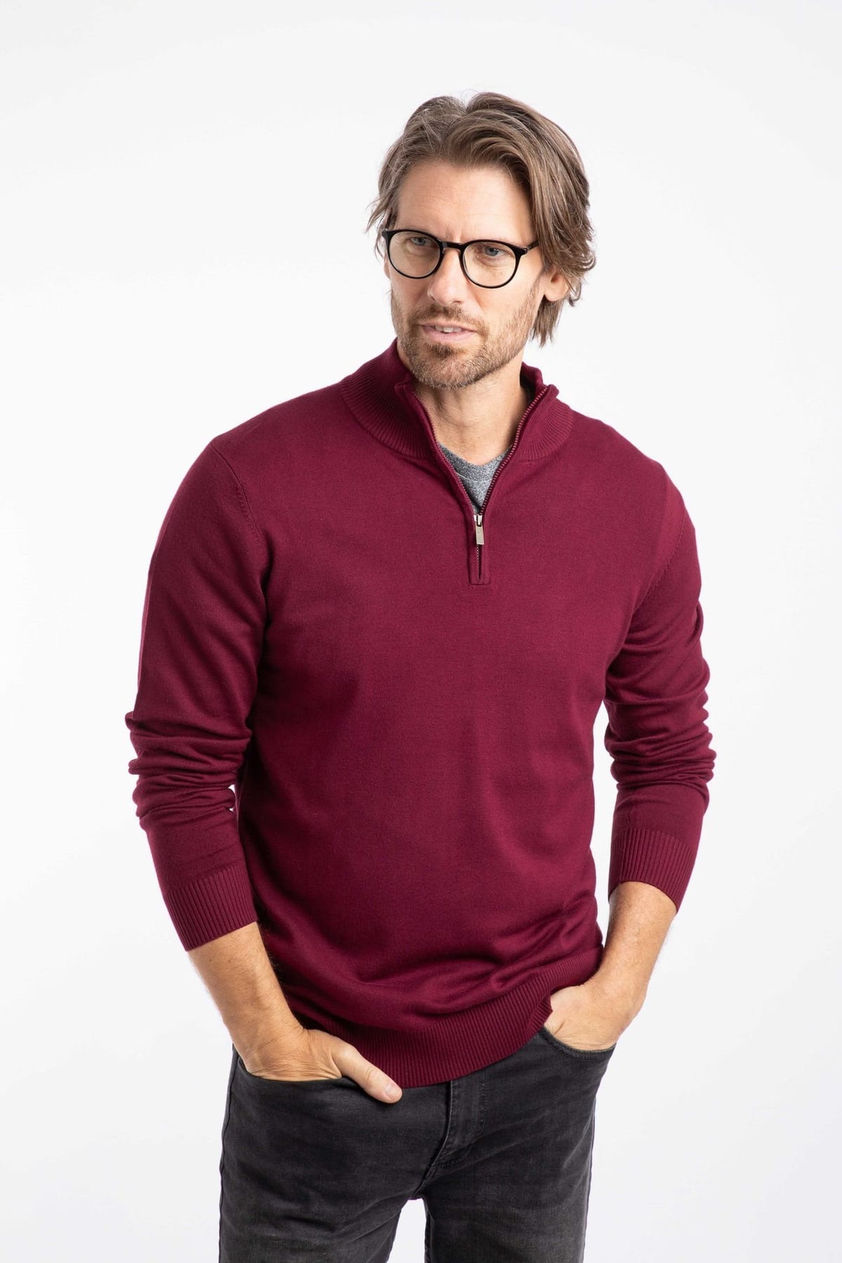 Timeless fine knit jumper in wine colour. Perfect for both dressy and casual occasions, it pairs well with shirts, chinos, T-shirts, and jeans.
