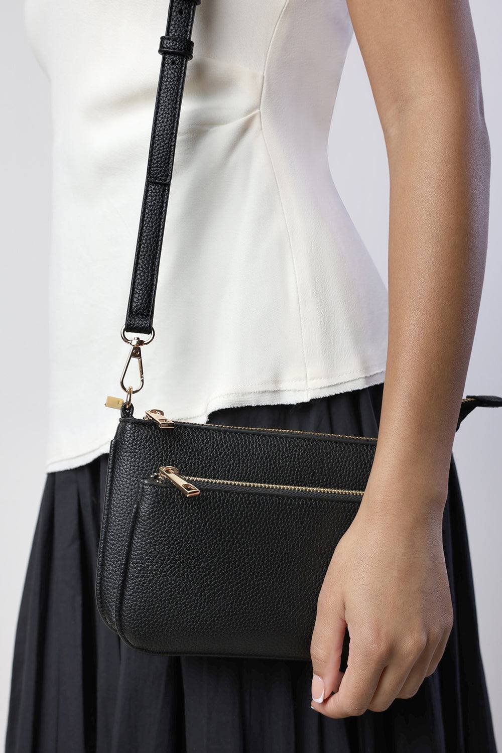 Stylish and practical black leather cross body bag with dual zip compartments for organized essentials. The adjustable strap allows for comfortable hands-free wear, perfect for everyday use.