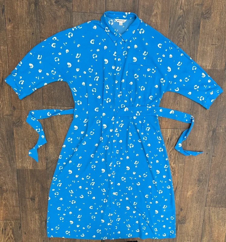 This midi shirt dress from Whistles is beautifully chic in a shade of blue with an all-over white leopard print. Featuring a shirt collar and stylish buttons down the front, it also includes a central matching tie waist belt for a flattering fit. Perfect for various occasions from casual to formal.