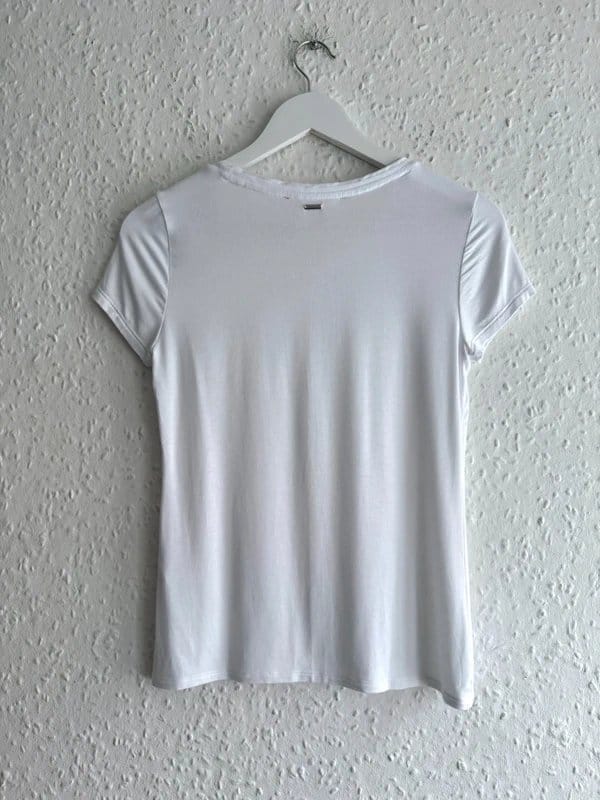 Classic White House Black Market short-sleeved white t-shirt in size S. Made from smooth, slightly shiny fabric, perfect for everyday wear.