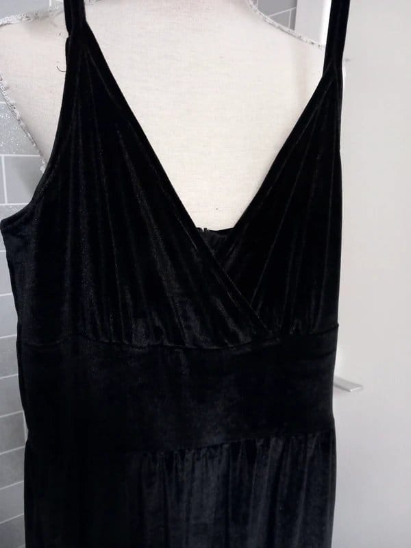 Stylish black velvet jumpsuit with a wide-leg silhouette and deep V-neckline. Features pockets and a stretchy quality for a comfortable fit. Ideal for UK sizes 16/18/20.