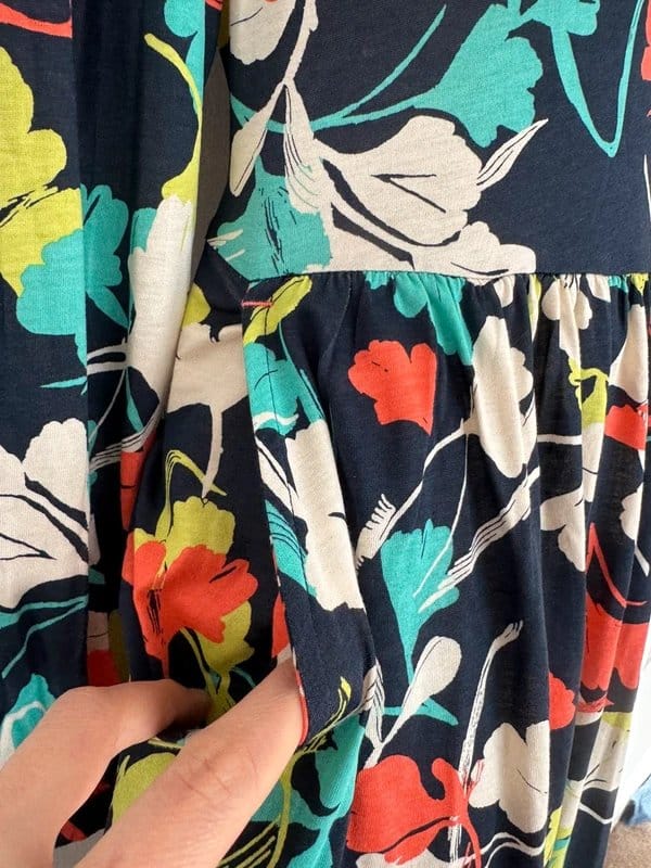 This White Stuff midi dress features a vibrant floral print in navy blue, white, yellow, and red. Made from a soft jersey fabric, it offers a comfortable and loose fit. The dress includes functional pockets on the front, perfect for casual outings.