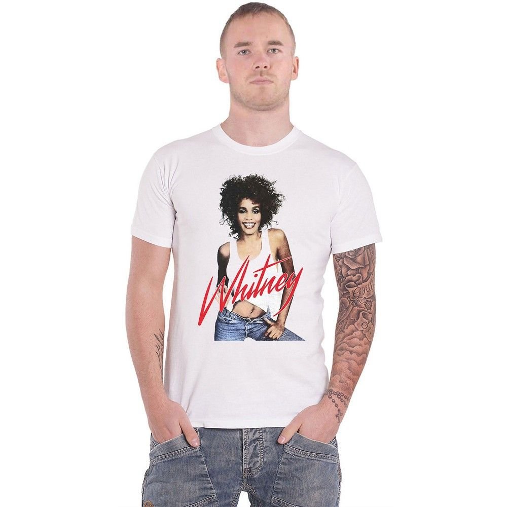 This white t-shirt features a photographic print of Whitney Houston with bold red text. Made from 100% ringspun cotton, it offers a soft touch and a classic fit. Ideal for casual wear, this tee is a stylish tribute to the iconic singer.