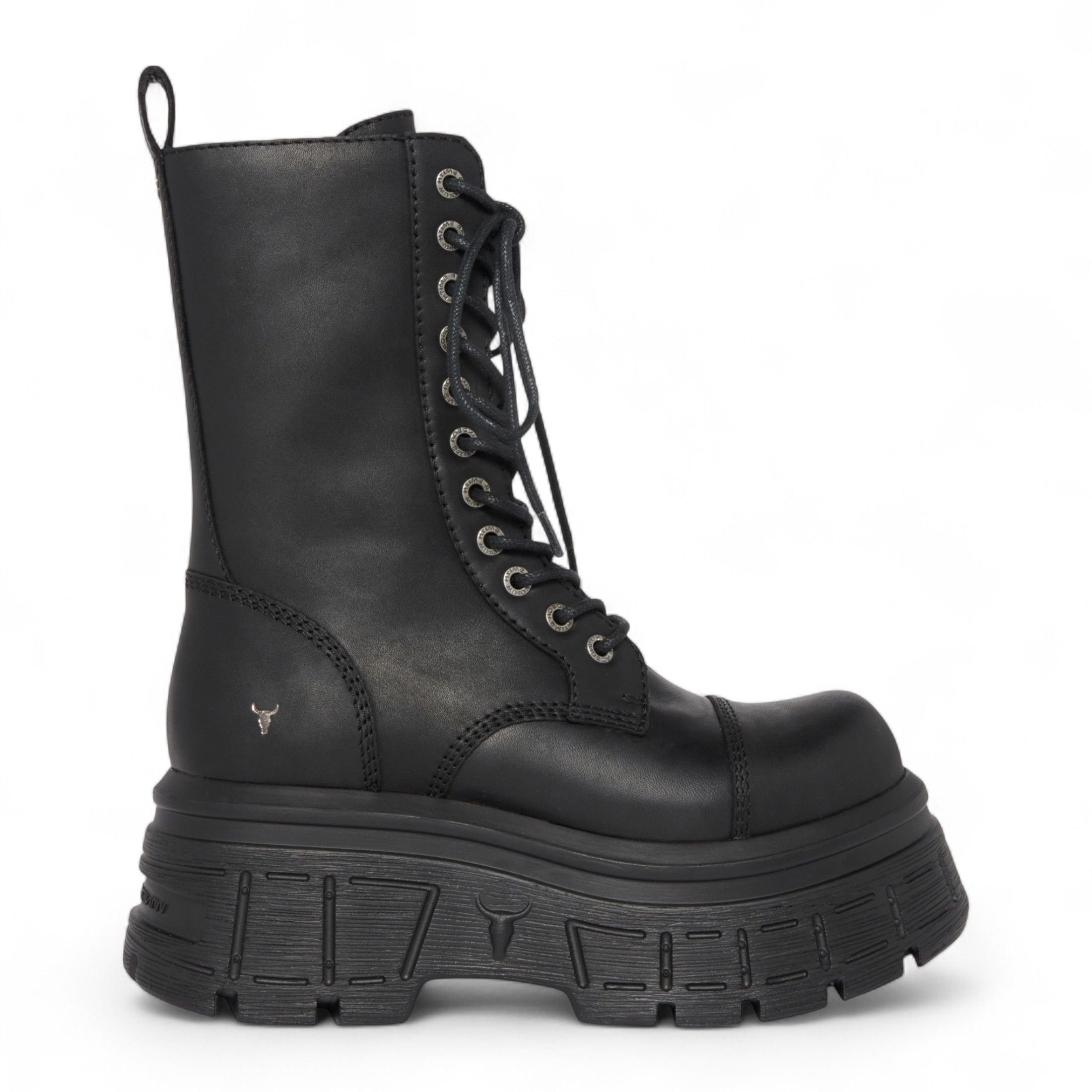 Fearless combat boots crafted from cow waxy leather. Featuring an elevated platform wedge sole, heavy cable stitch detail, and reinforced toe cap. Perfect for making a bold statement.