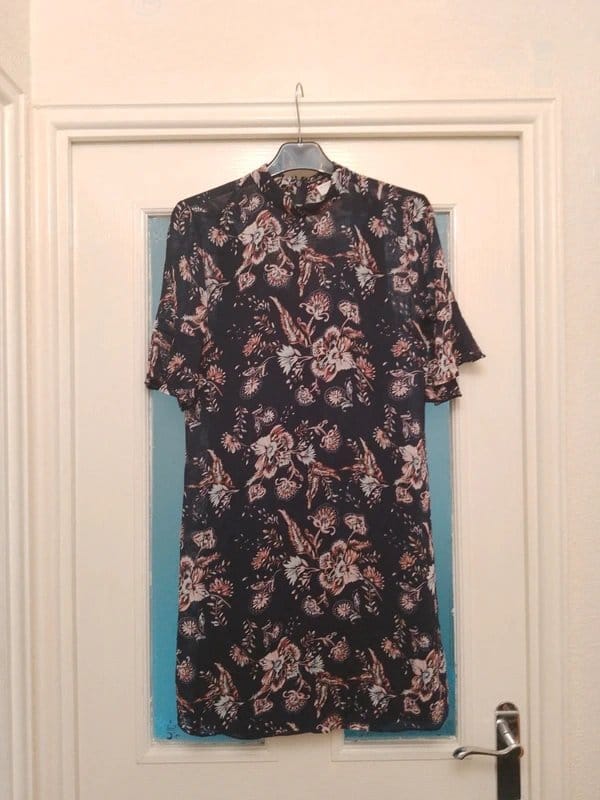 This navy blue chiffon dress by Witchery features a floral print in shades of pink, blue, and burgundy. Fully lined with a back zipper fastening, it has frilly sleeves and a floaty, excellent quality fabric. Perfect for summer occasions.
