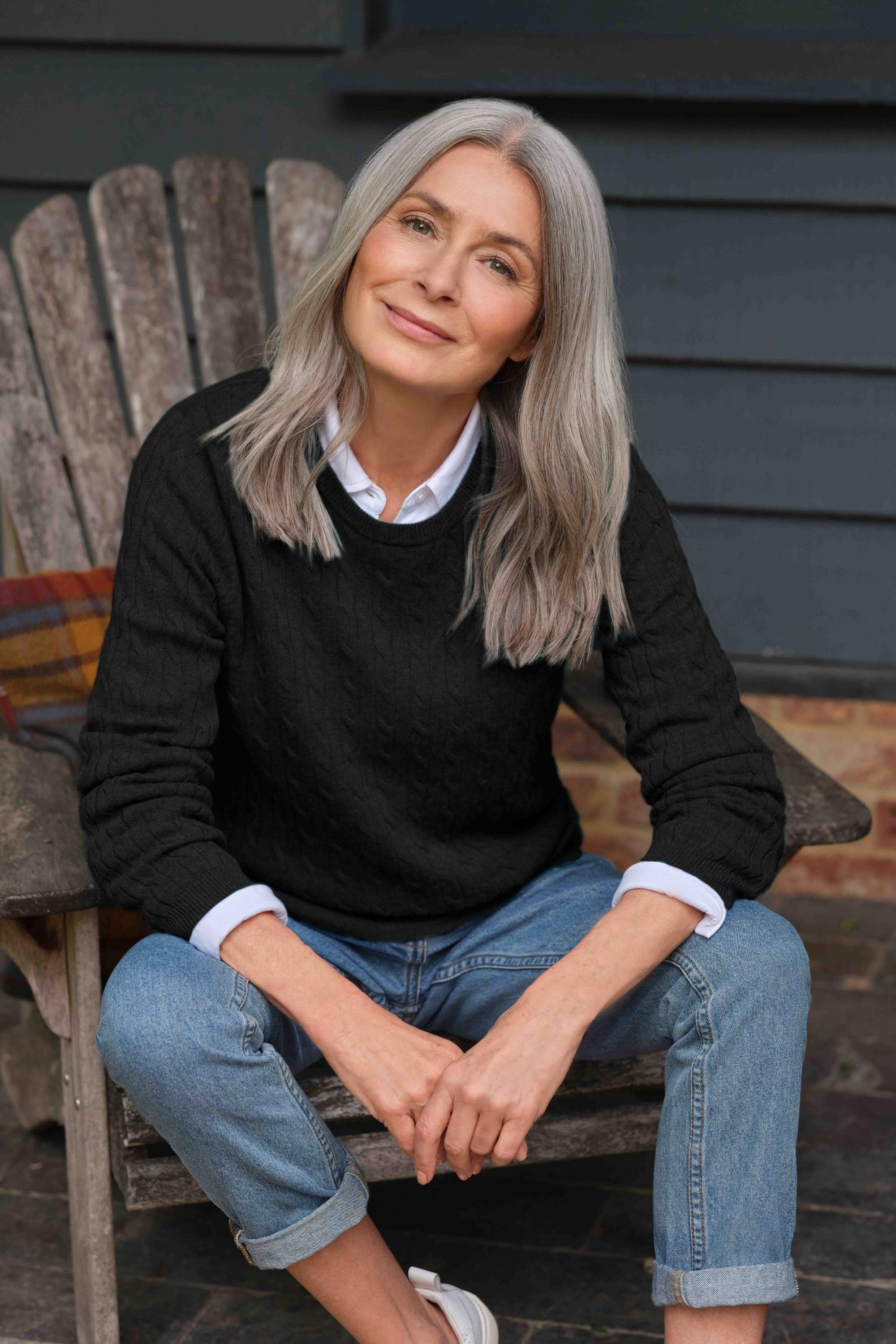 Luxurious cashmere jumper in black with a crew neckline and cable knit pattern. Perfect for adding a touch of elegance to your casual wardrobe.