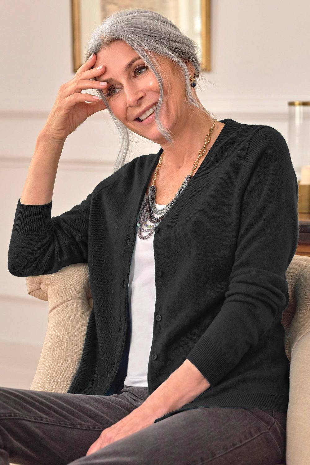 The WoolOvers Black Cashmere Merino V Neck Cardigan is ideal for casual, everyday, work.