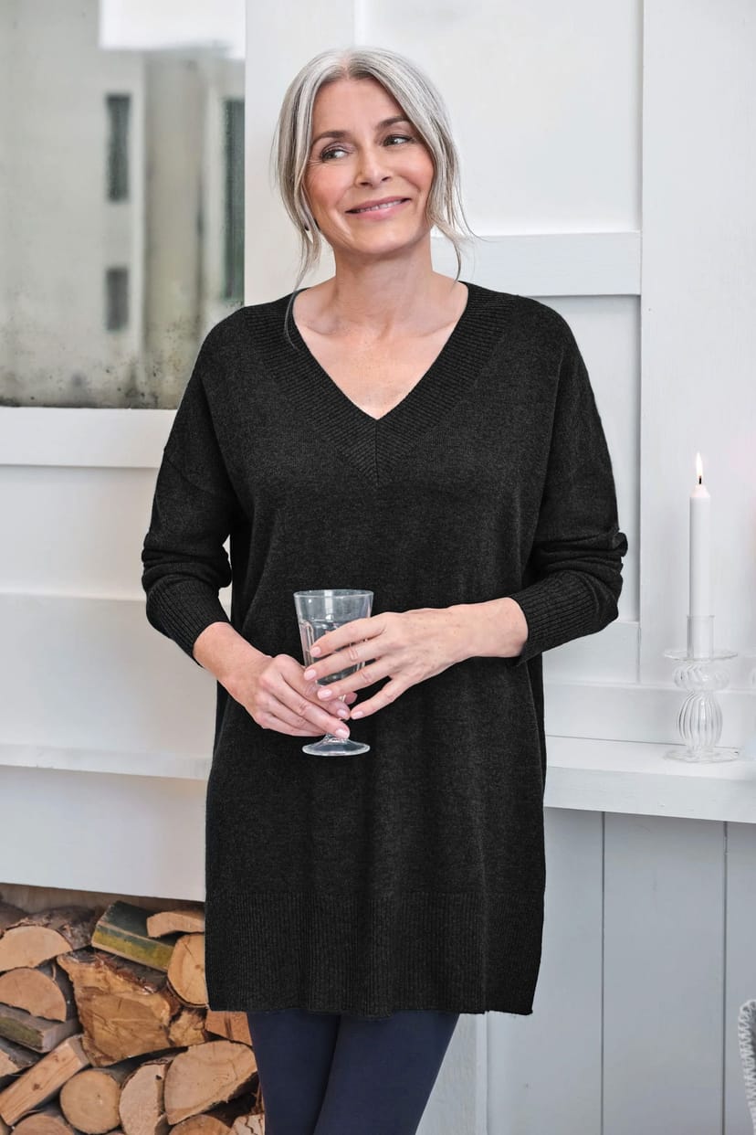 This oversized knit tunic in black cashmere and merino features a deep V-neckline and a ribbed hem. Perfect for layering over leggings or jeans.