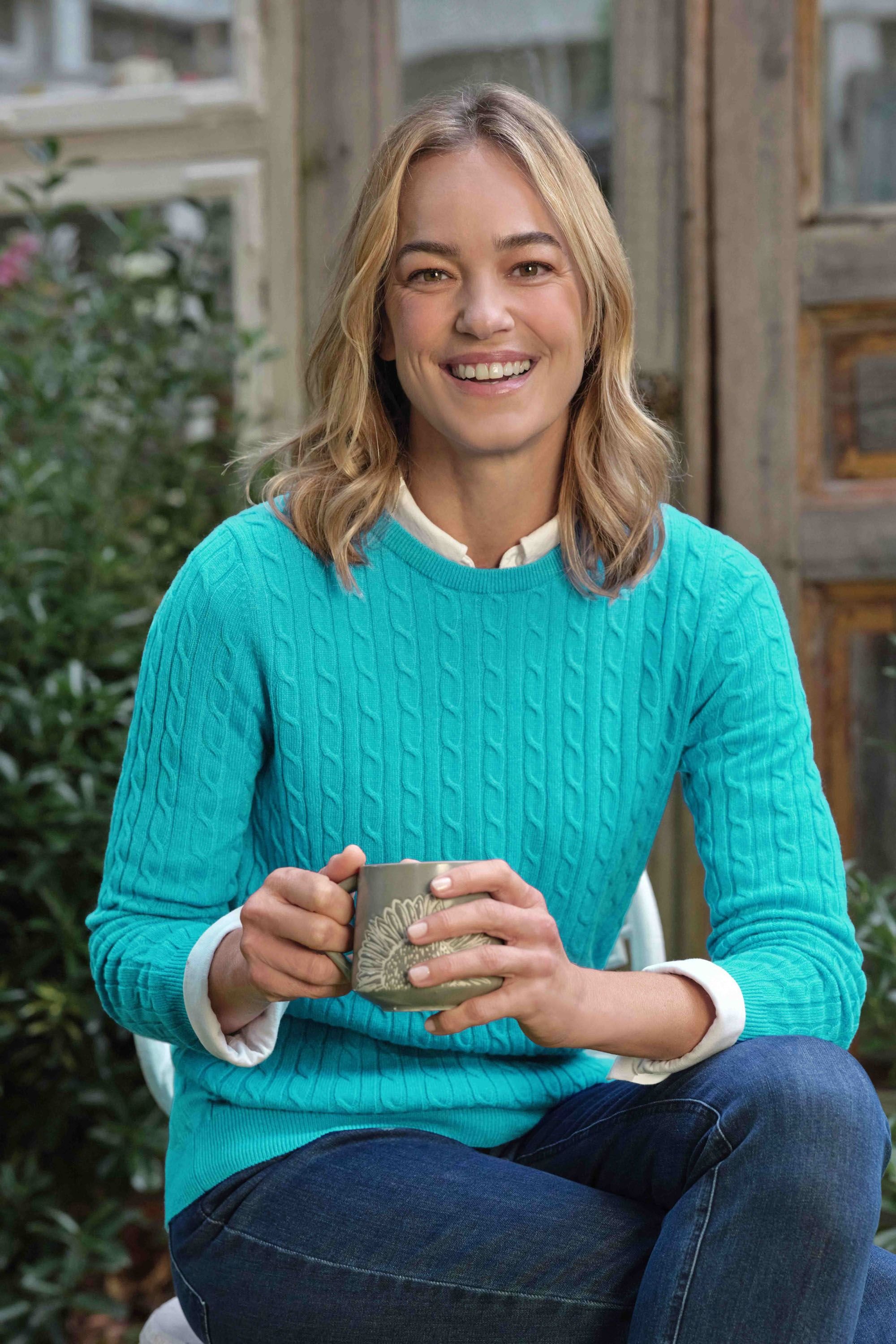 Luxurious blue cashmere jumper with a cable knit pattern and crew neckline. Perfect for a cozy, stylish look.