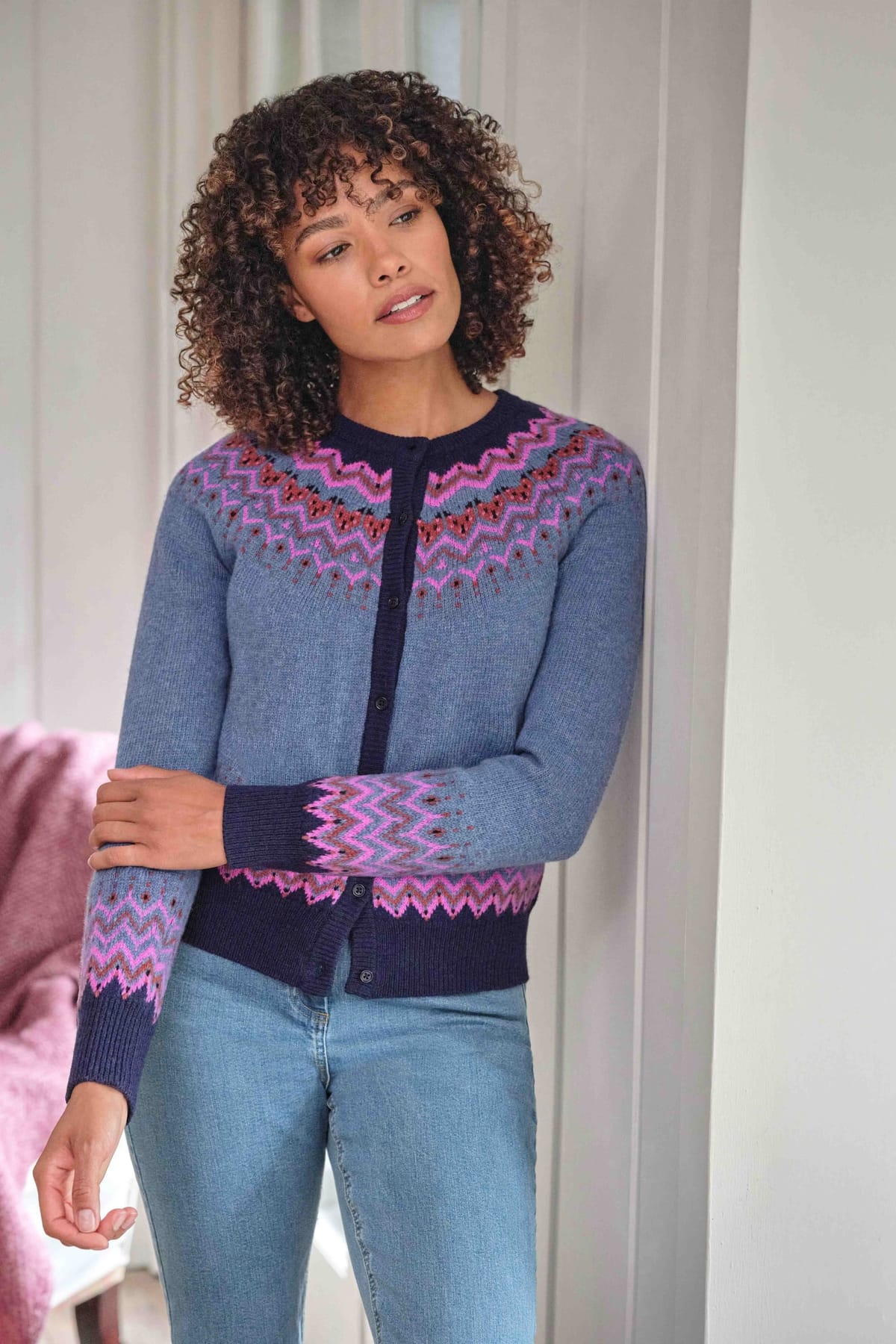The WoolOvers Dark Navy Nordic Fairisle Yoke Cardigan is made from lambswool.