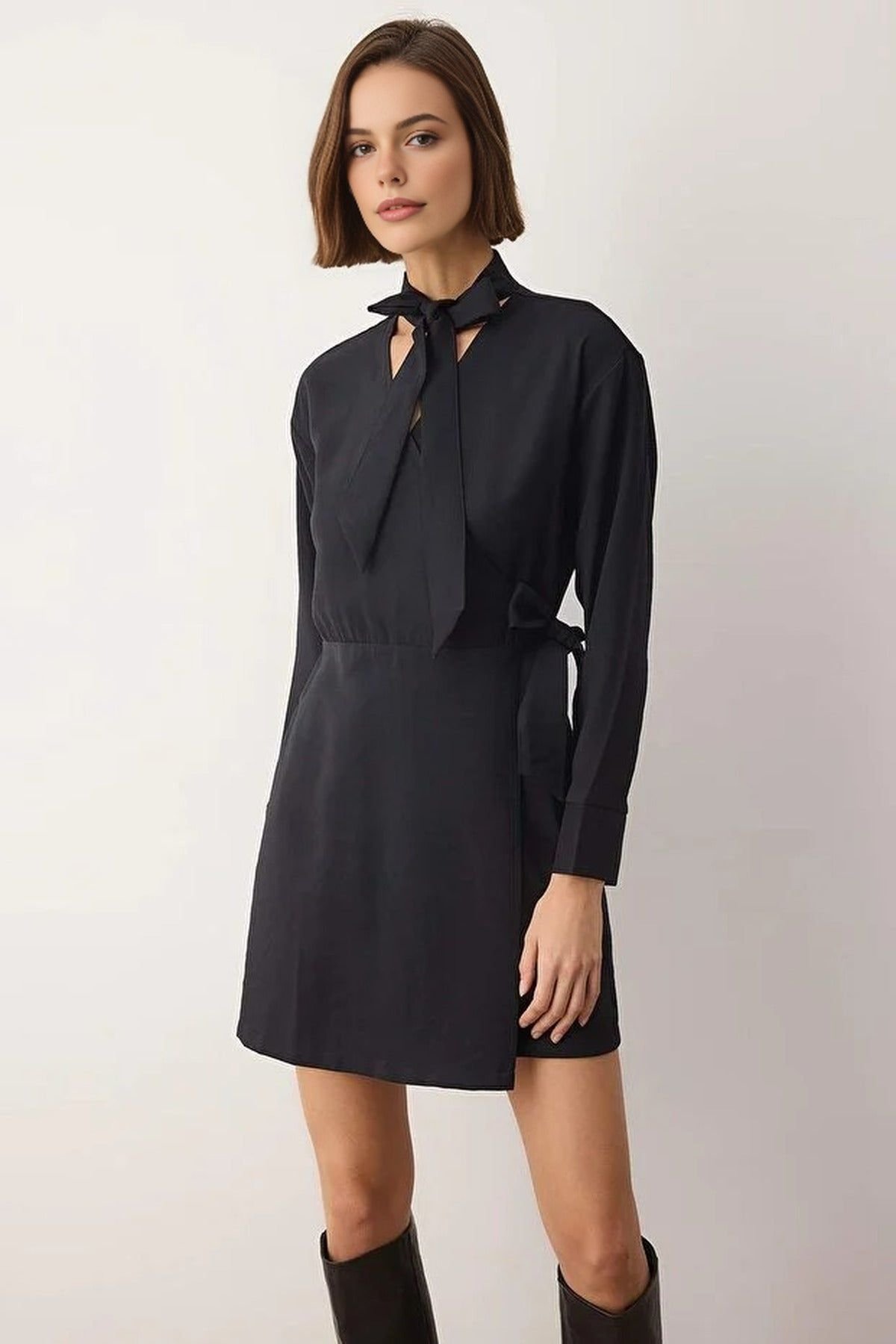 Stylish black woven mini dress with a refined tie neck detail and long sleeves. Perfect for everyday wear, this dress offers a clean and structured silhouette.