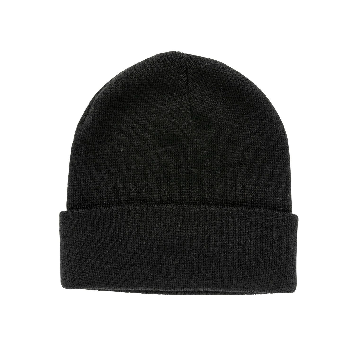 Stylish beanie in black featuring a plain design. Made from Polylana fabric, it offers a turned-up cuff for added warmth and style. Ideal for casual and outdoor activities.