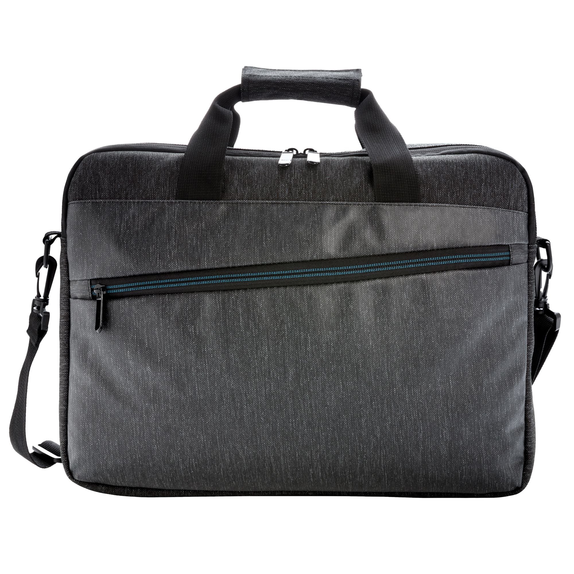 Stylish black laptop bag made from polyester with a sleek design. Features a 15.6" padded laptop sleeve, adjustable straps, and a zip front pocket. Ideal for professional use.