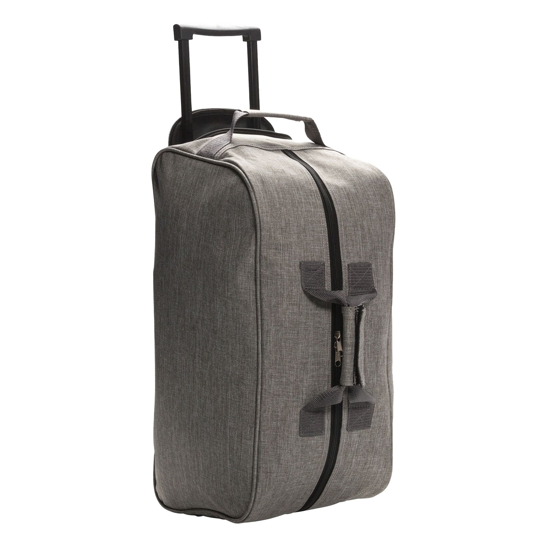Stylish grey polyester trolley bag with a spacious main compartment, front zipper pocket, and two-tone design. Features two wheels, extendable trolley handle, and hook & loop wrap. Perfect for travel and everyday use.