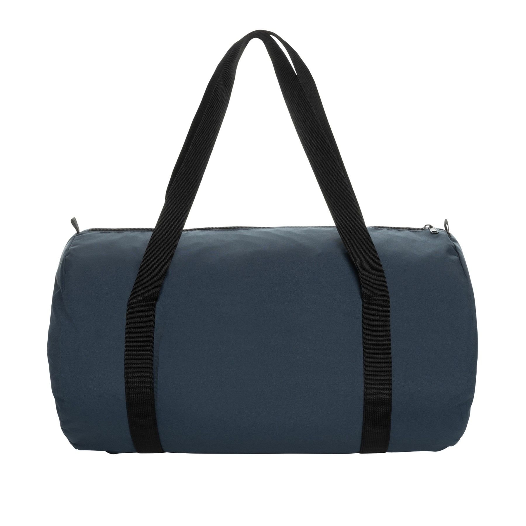 Stylish navy blue duffel bag made from recycled polyester and polyester. Features a single main compartment, foldable design, and durable construction. Ideal for sports and travel.