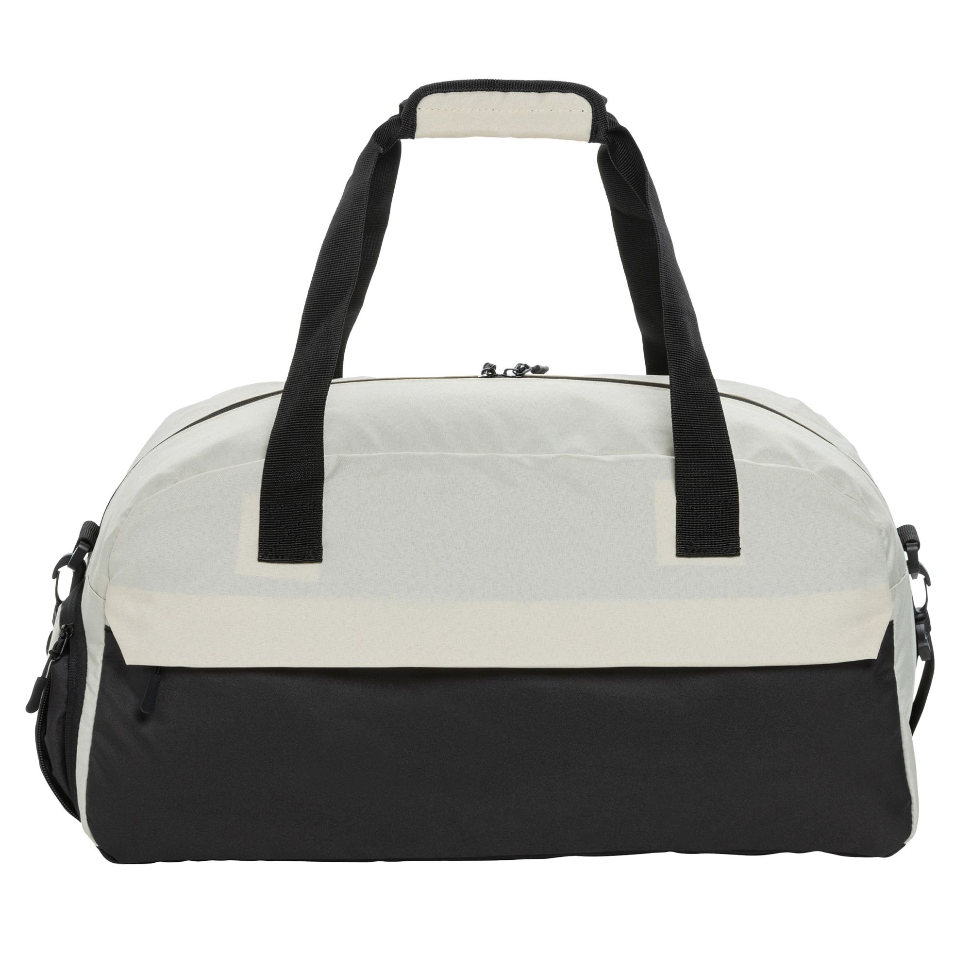 Stylish off-white duffle bag made from Polyester and RPET. Features a two-way zip fastening, adjustable strap, and a front zip pocket. Ideal for gym, travel, or everyday use.
