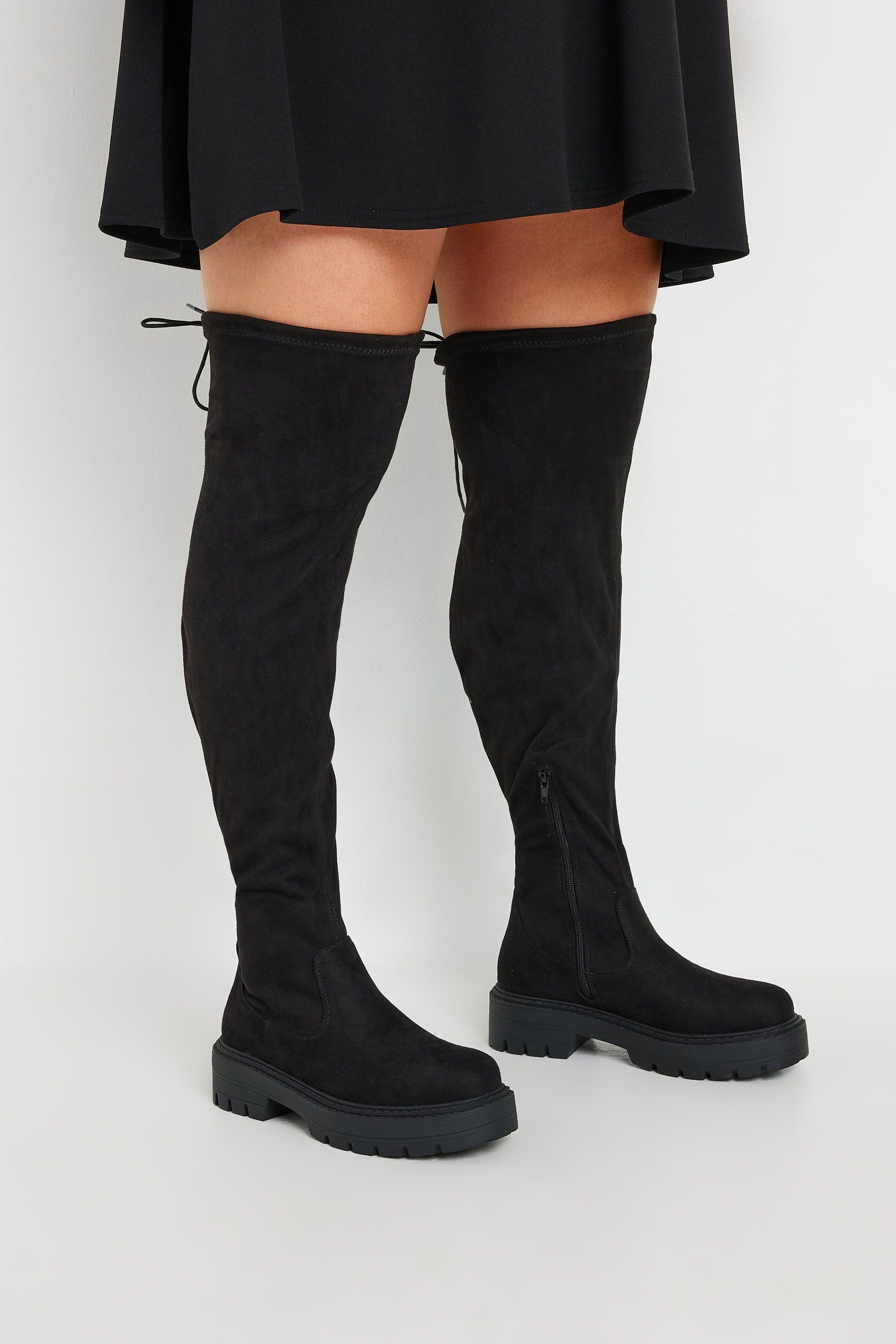 Make an entrance with these new-in black faux leather knee-high boots. Designed in an extra wide fit, these boots feature a flatform design with back tie details, a side zip fastening, and a chunky platform sole. The perfect finishing touch for your new season looks.