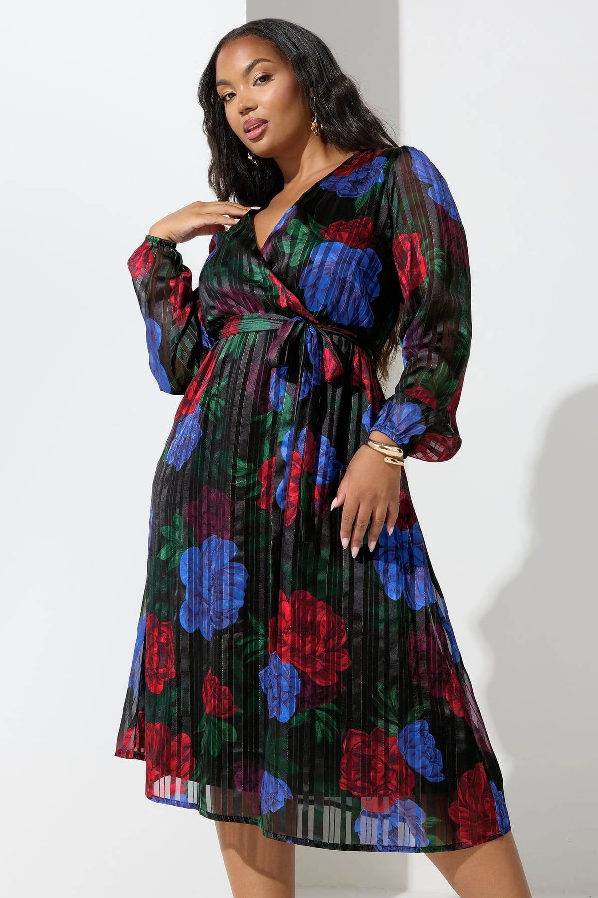 Stylish floral metallic wrap dress in black with a wrap neckline and tie waist belt. Features long sleeves and a midi length. Ideal for special occasions like weddings and christenings.