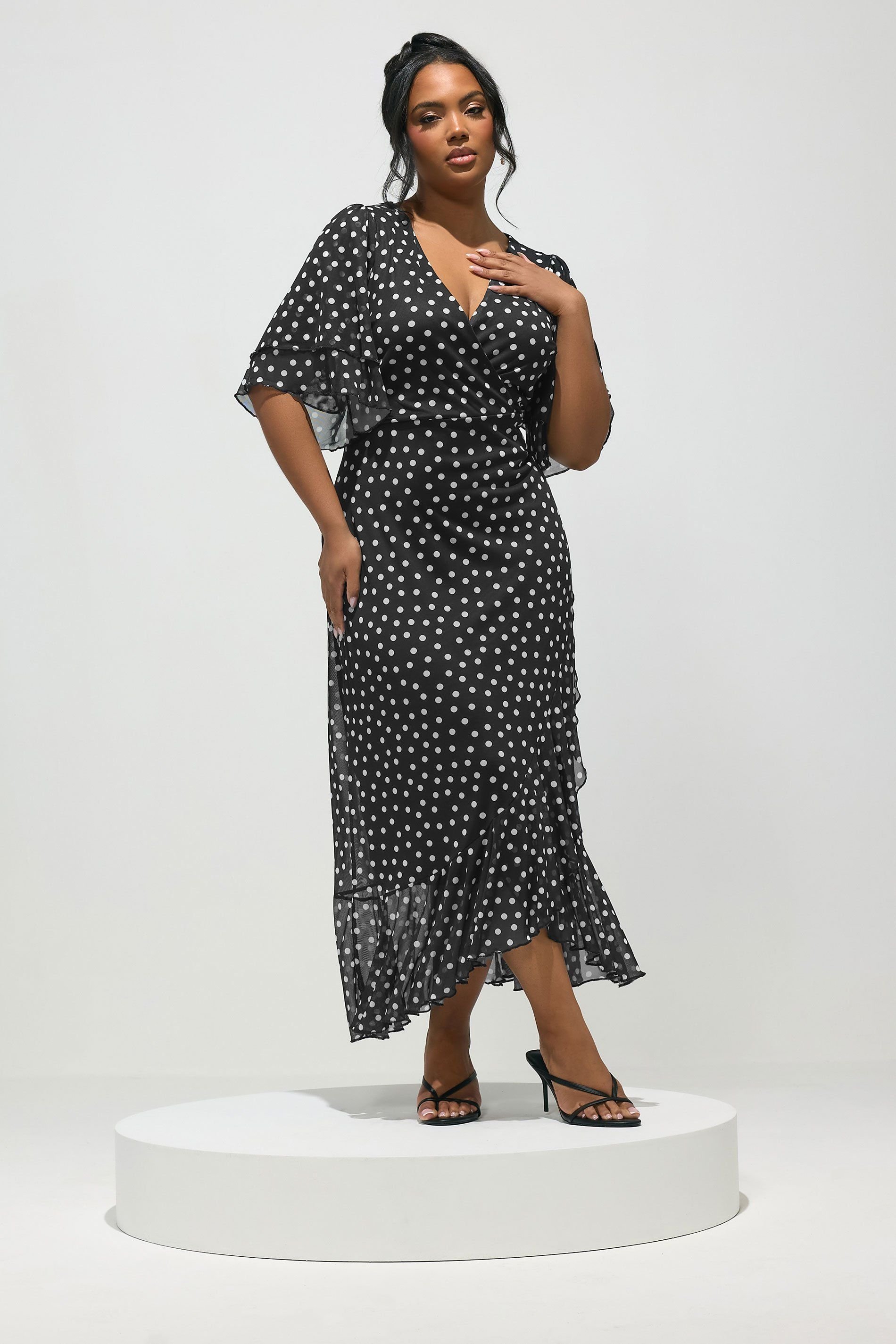 The Yours London Black Polka Dot Wrap Dress is available in sizes 20.