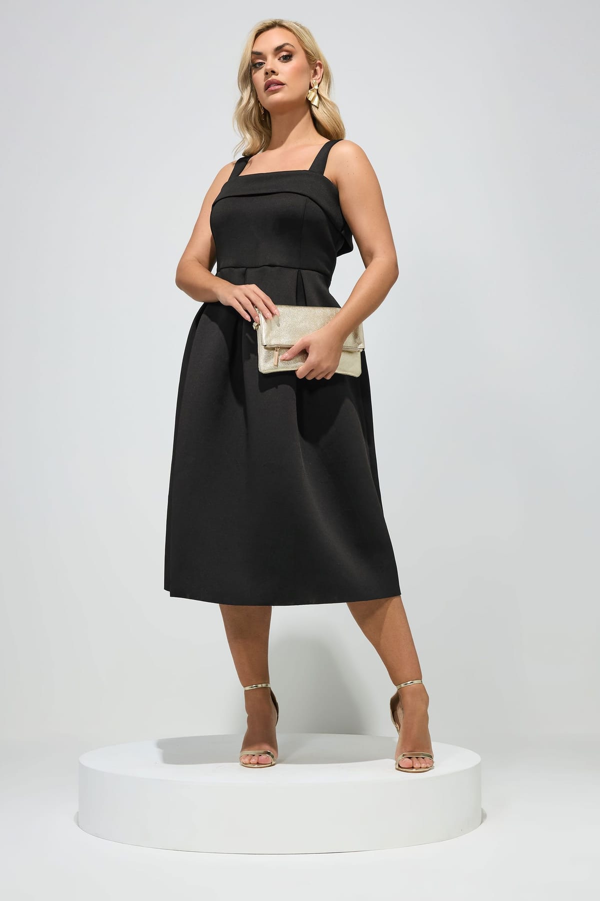 The Yours Black Scuba Square Neck Midi Skater Dress is available in sizes 14, 16, 18, 20, 22, 24.