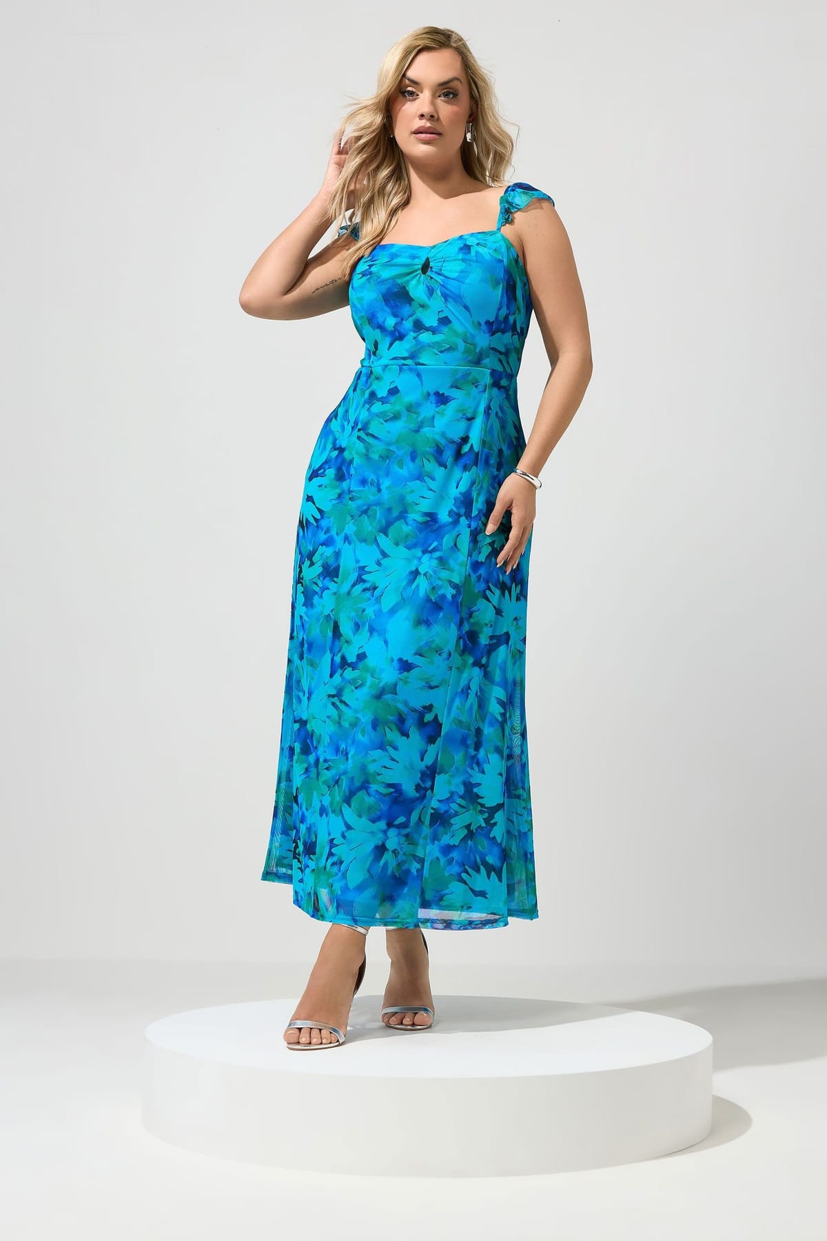 The Yours Bright Blue Abstract Ruffle Maxi Dress is available in sizes 16, 18, 20, 22, 24, 26-28.