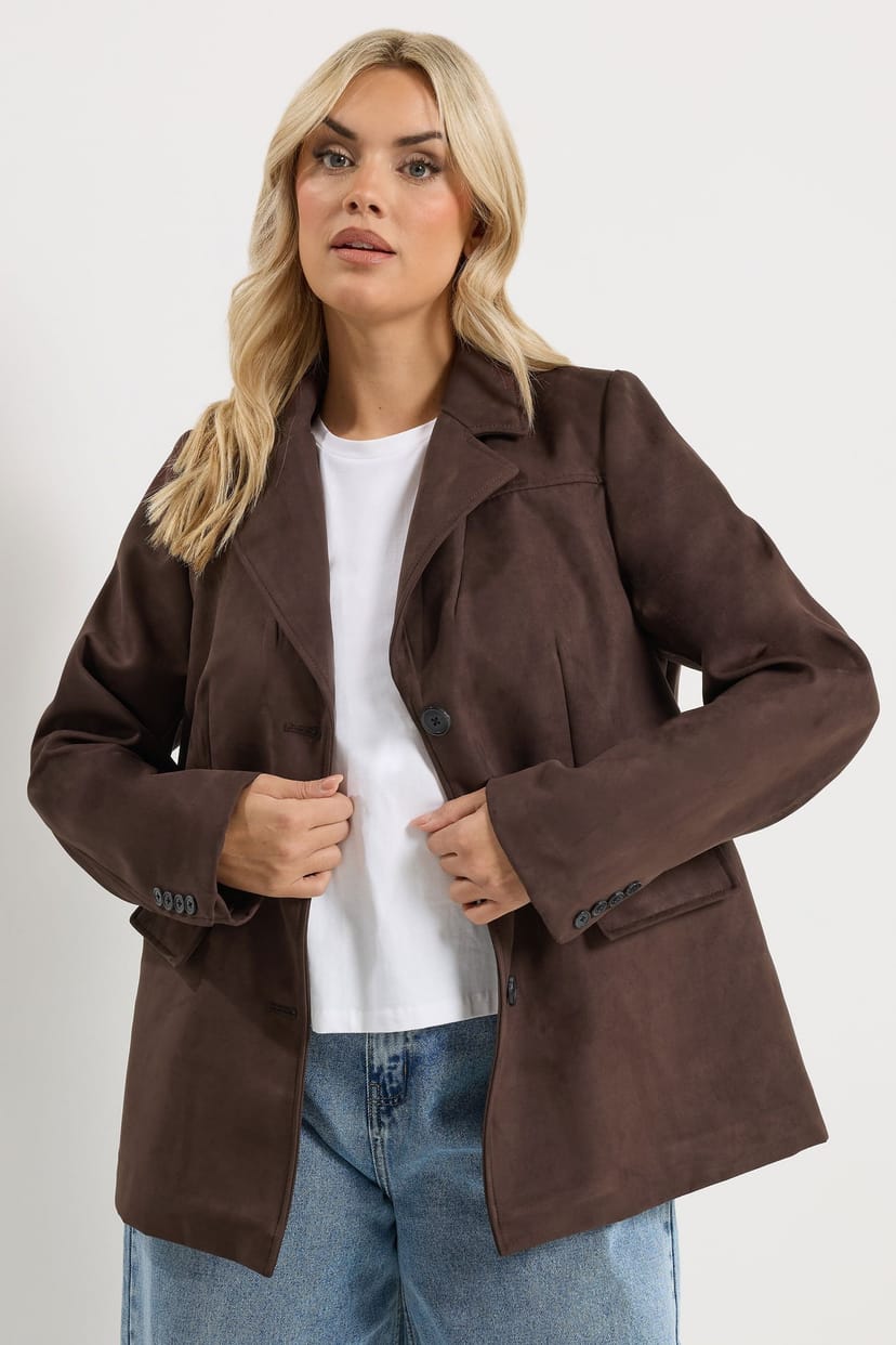 The Yours Chocolate Faux Suede Blazer is available in sizes 22, 24, 26.
