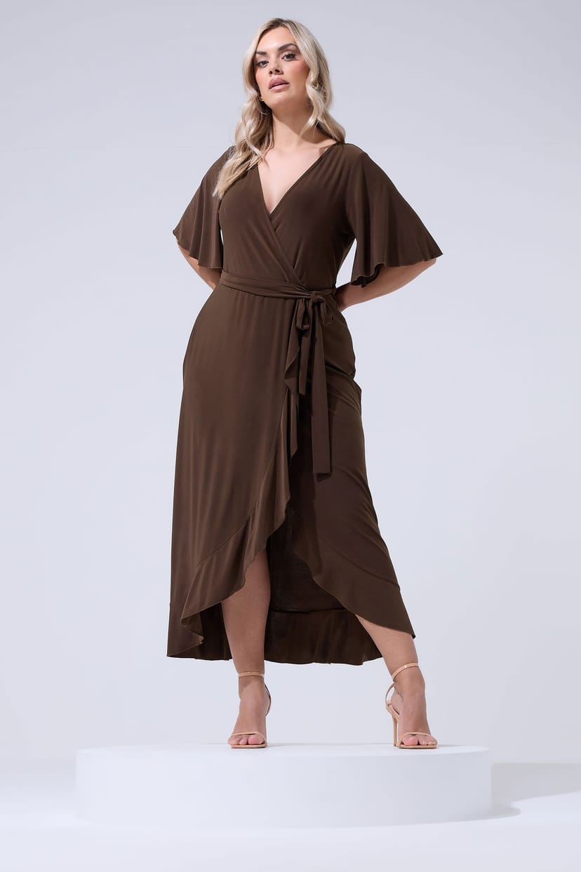 The Yours Chocolate Jersey Wrap Dress For Plus-Size Women is available in sizes 16, 18, 20, 22, 24, 26-28.