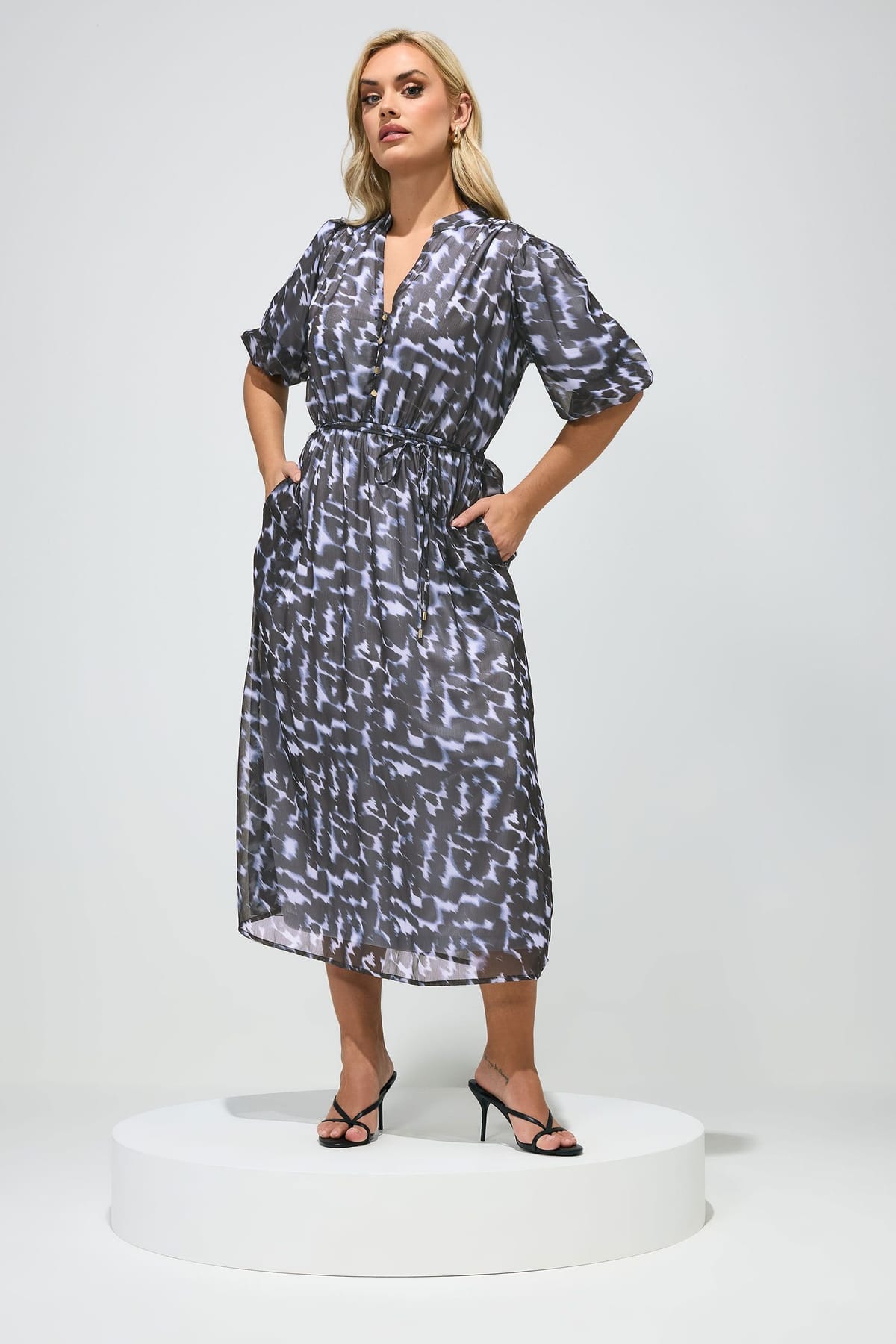 See all outfit ideasElegant shirt dress in dark blue with an abstract animal print. Features short puff sleeves, button fastenings, and a tie waist belt for a flattering fit. Ideal for evening events or date nights.