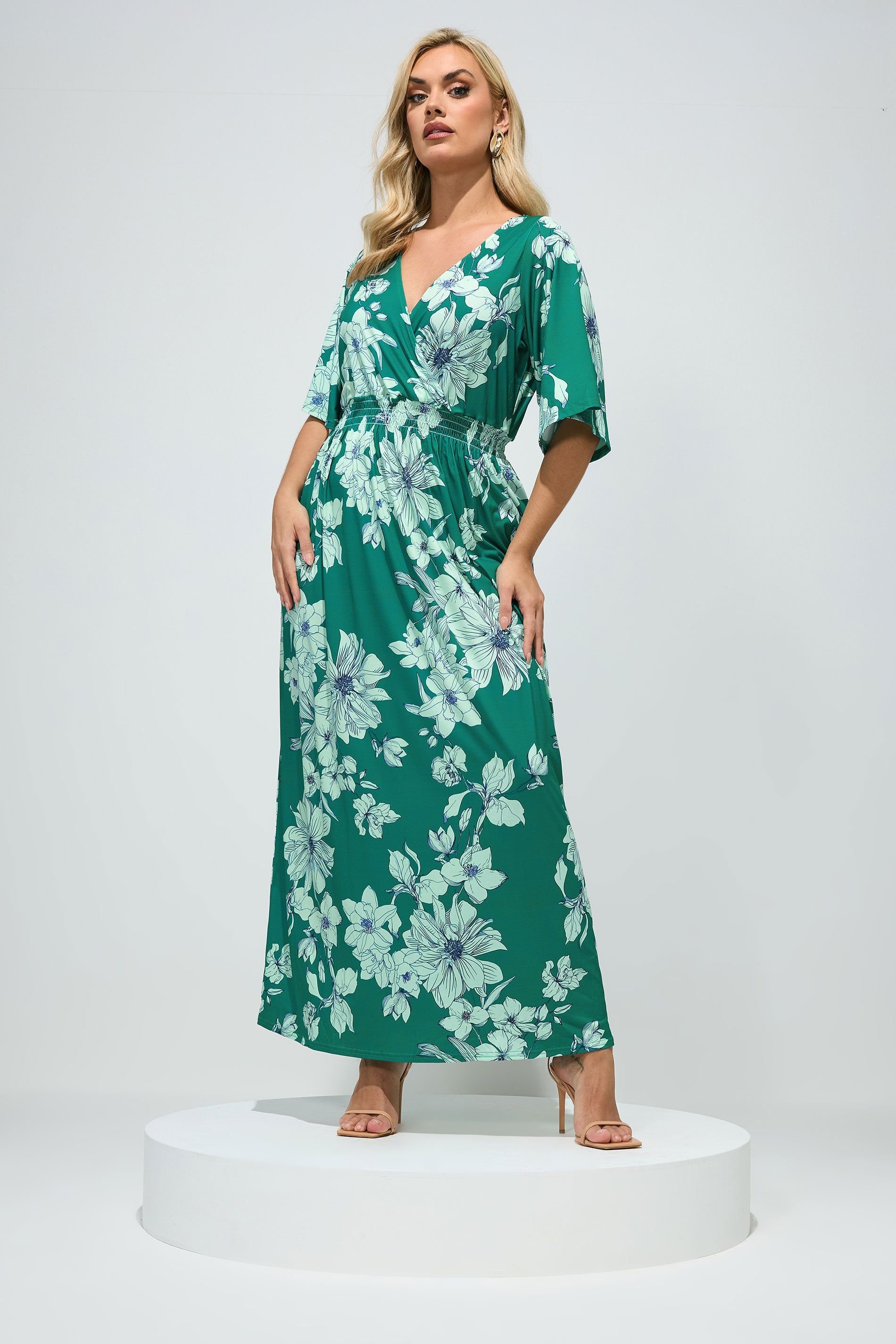 This Yours London maxi dress in green floral print offers a flattering fit for every body. Perfect for wedding guest occasions, special events, and evening wear.