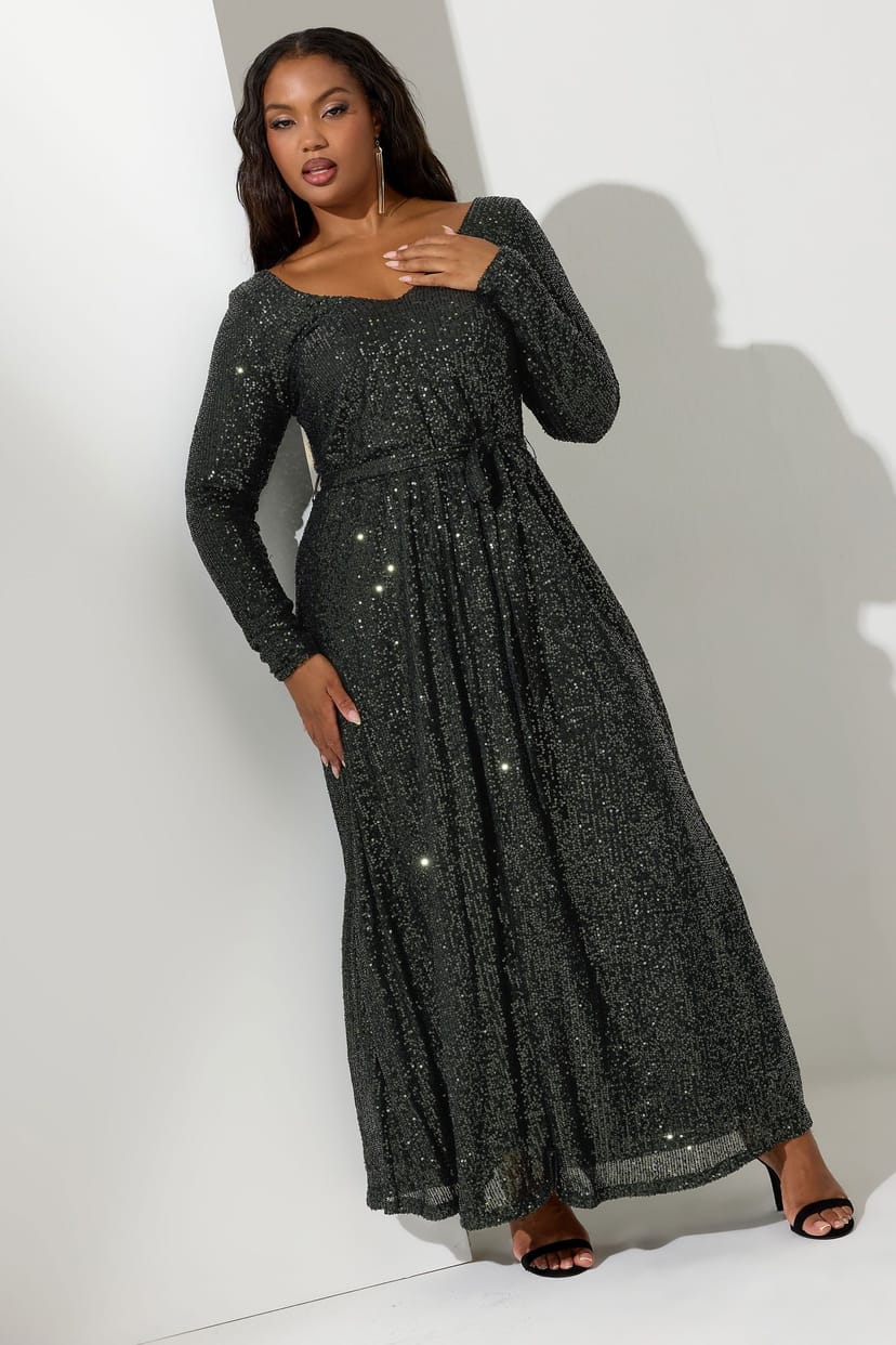 This green sequin maxi dress from Yours Curve is perfect for parties. Made from a comfortable woven fabric, it features sequin embellishments, long sleeves, and a v-neckline. Ideal for evening events.
