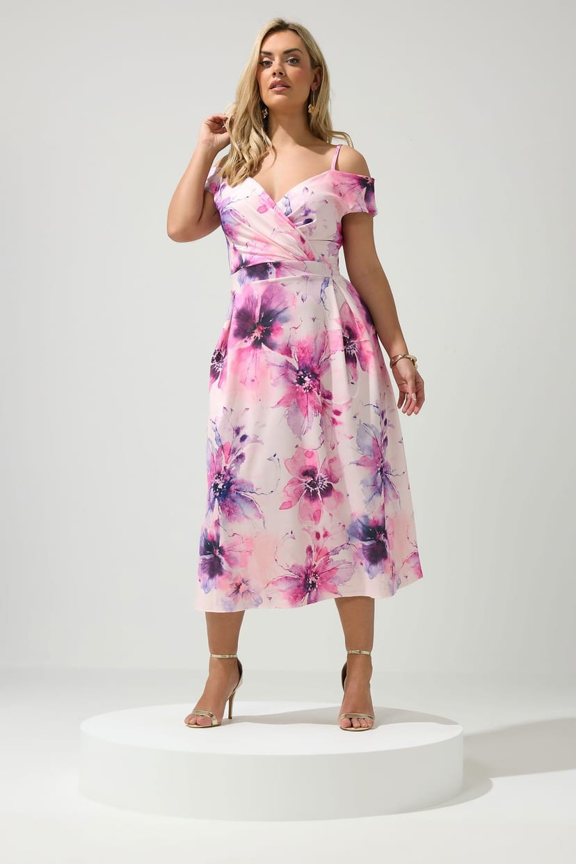 The Yours Light Pink Floral Skater Dress for Women is available in sizes 20, 22, 24, 26-28.