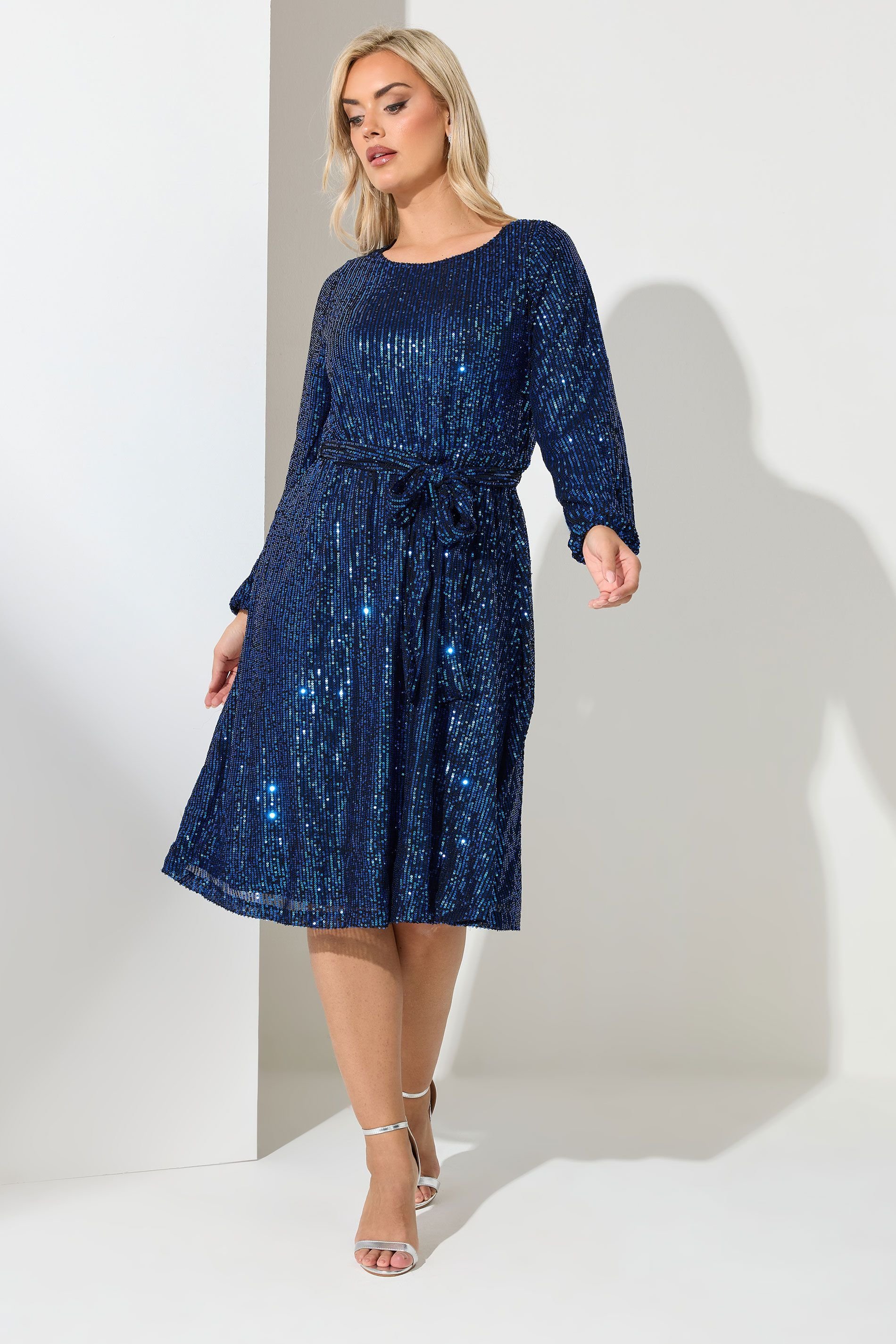 The Yours Mid Navy Sequin Skater Dress is available in sizes 18, 20, 22.