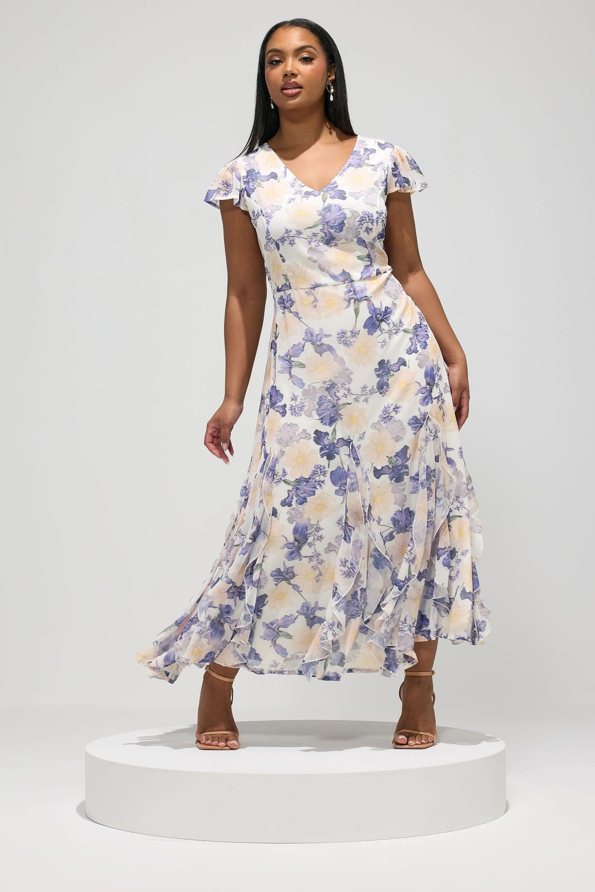 This Yours London maxi dress features a floral print, short sleeves, V-neckline, zip back fastening, ruffle godet hemline, and flowing maxi length. Perfect for a wedding guest or casual outings.