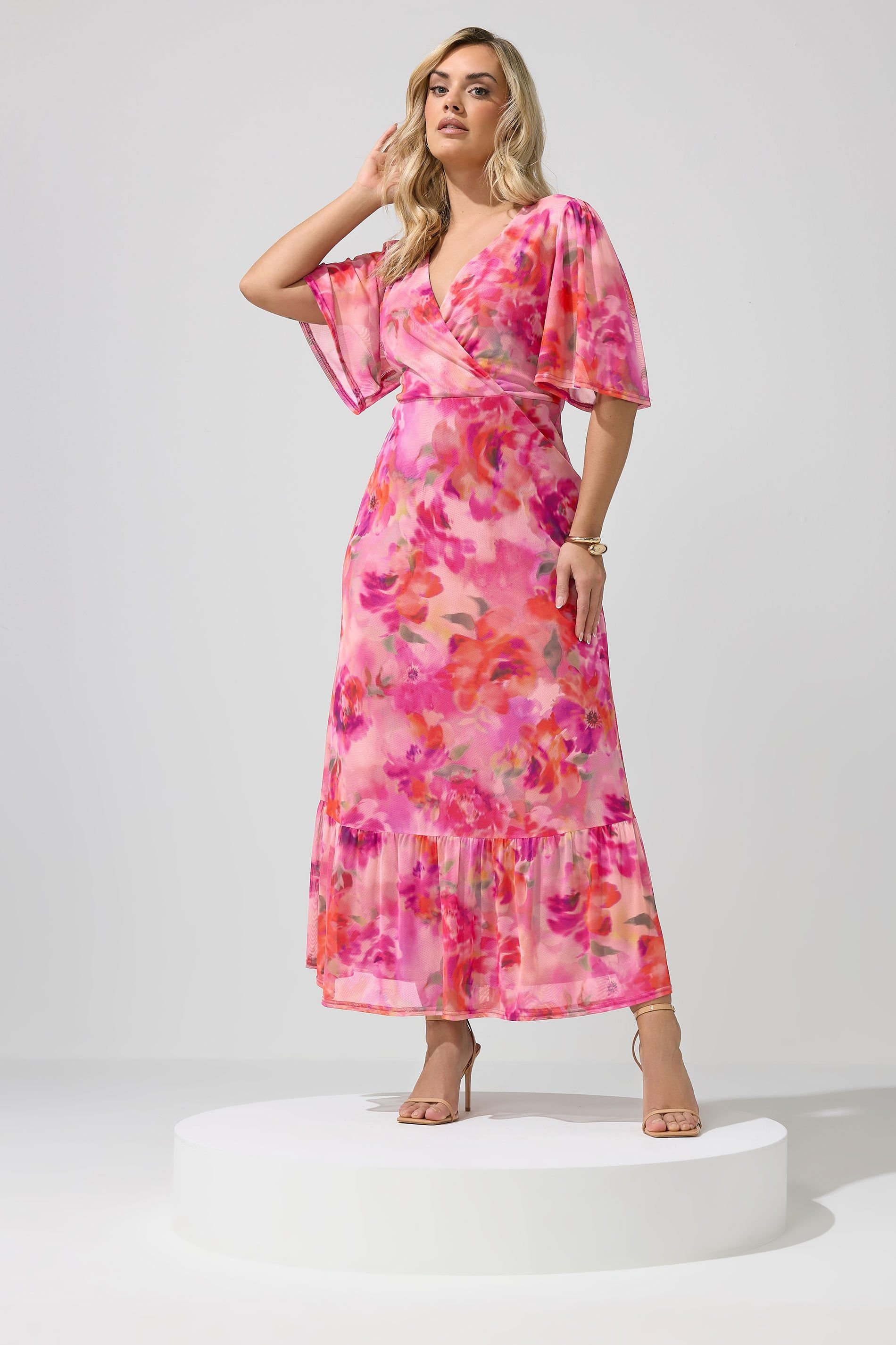 The Yours Pink Floral Wrap Ruffle Hem Dress is available in sizes 18, 20, 22, 24.