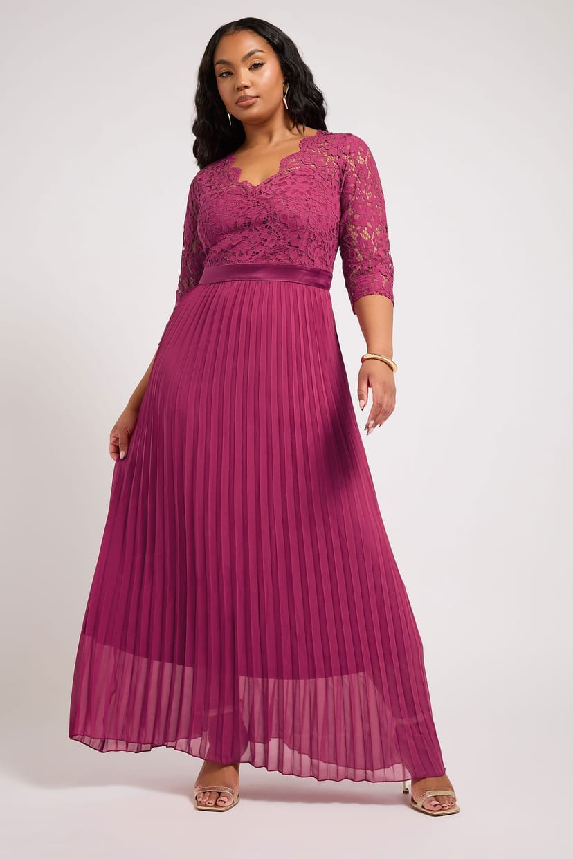 This pink lace wrap pleated maxi dress by Yours London Curve is designed for women and curves, offering a flattering fit for every body. Featuring lace detailing, a v-neckline, pleated skirt, 3/4 sleeves, and a maxi length. Perfect for prom, wedding guest occasions, and bridesmaids events.