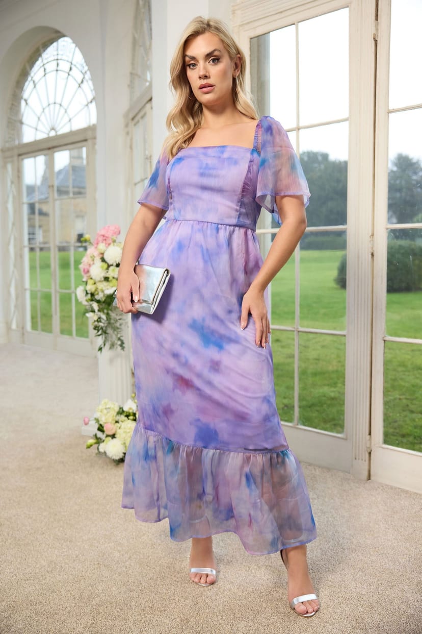 The Yours Purple Abstract Organza Maxi Dress is available in sizes 16, 18, 20, 22, 24, 26-28.