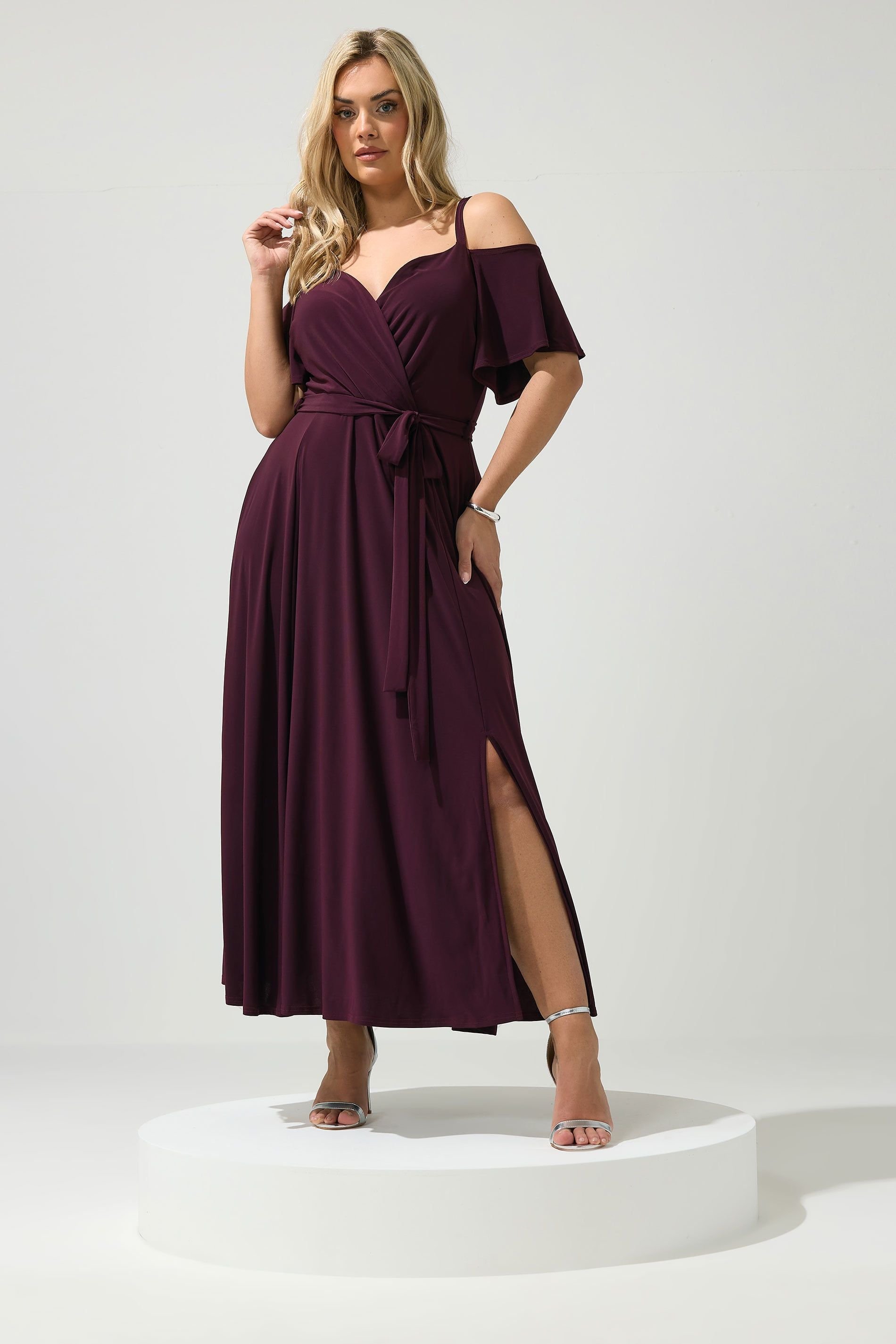 The Yours Purple Satin Cold Shoulder Maxi Dress is available in sizes 20, 22, 24, 26-28, 30-32.