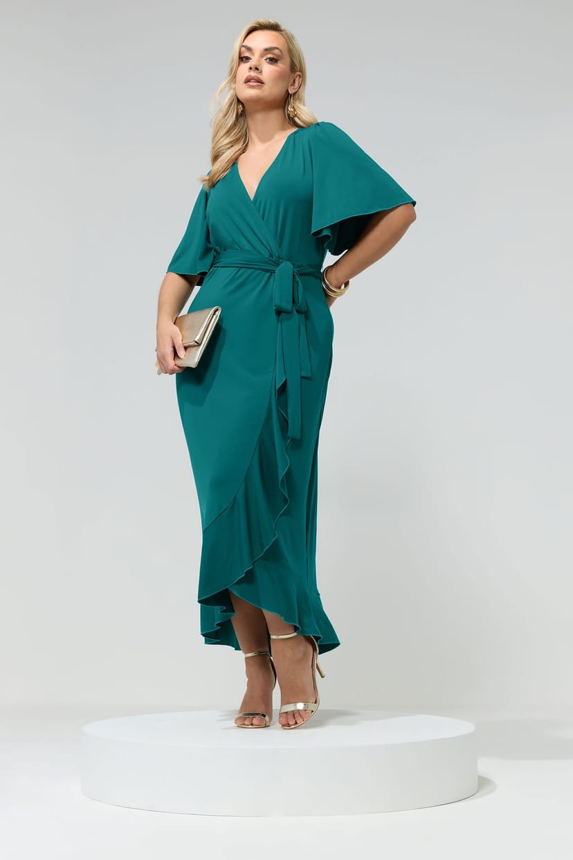 This teal jersey wrap dress from Yours Curve is designed for plus-size women in UK sizes 14-32. It features a flattering wrap style, ruffle hem, short sleeves, a V-neckline, and a belted waist to beautifully accentuate your curves. Perfect for special occasions.
