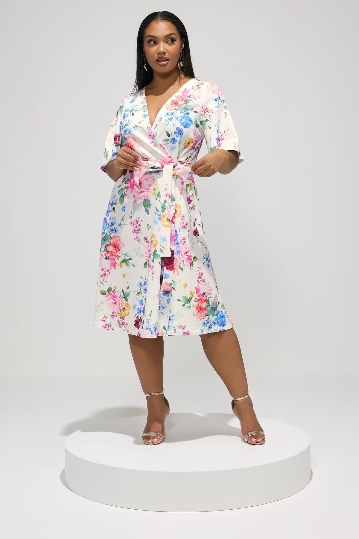 Charming floral wrap skater dress in white with a flattering fit for curves. Features a wrap front, belted design, and short sleeves. Ideal for prom, bridesmaids, and wedding guest events.