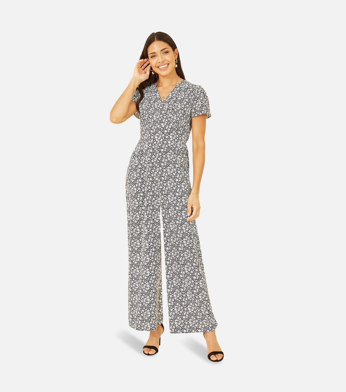 Stylish black floral print jumpsuit with a V neckline and short sleeves. Features a wide-leg silhouette for a relaxed fit. Ideal for casual outings or summer events.