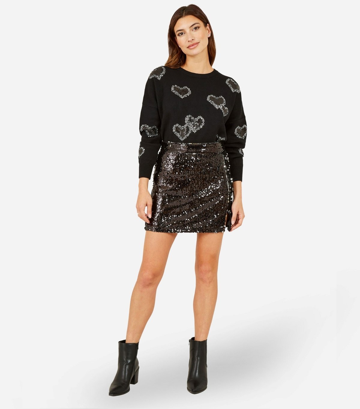 This black sequin mini skirt from Yumi features a slim fit and a high-rise waist. Perfect for a night out or a casual day look.