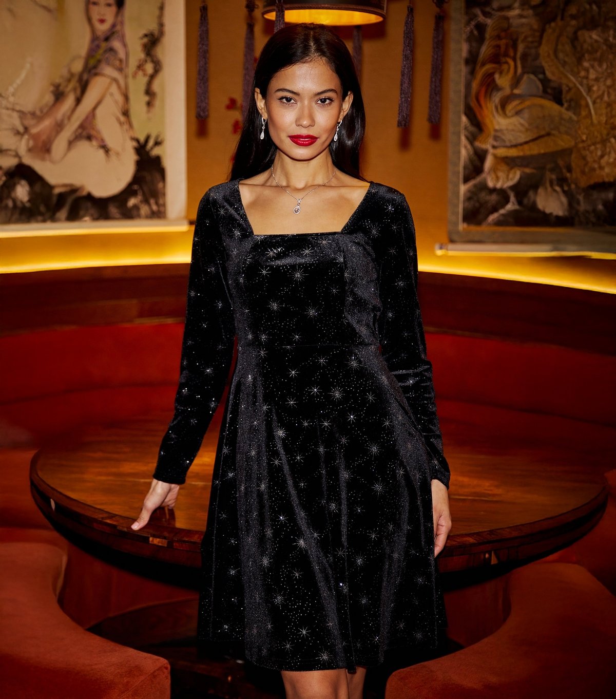 This black velvet mini dress by Yumi features a square neckline and long sleeves. The star foil design adds a touch of glamour, making it perfect for evening events or special occasions.