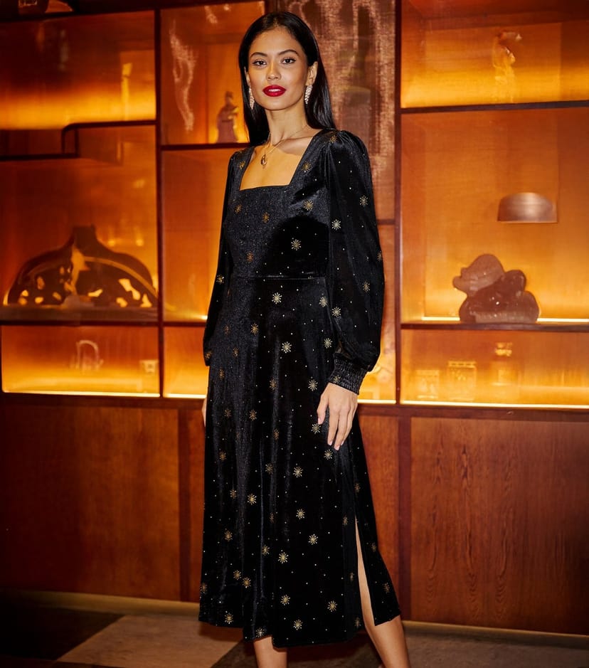 Stylish black velvet midi dress by Yumi featuring a square neckline and long sleeves. Adorned with star gold foil details, it offers a slim fit and is perfect for evening events.