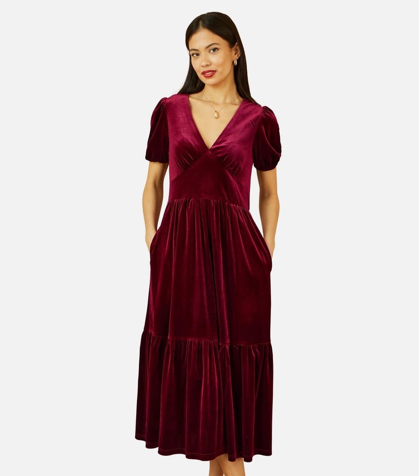 Sophisticated midi dress in burgundy velvet featuring a V-neckline and short sleeves. The tiered skirt adds volume and elegance, perfect for special occasions.